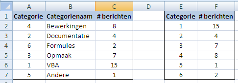 In dit voorbeeld zie je dat we twee tabellen hebben. Eén met de categorie-nummers en categorie-omschrijvingen, en één met de categorie-nummers en het aantal berichten. In de praktijk zullen de twee tabellen zich vaak in verschillende werkmappen bevinden.